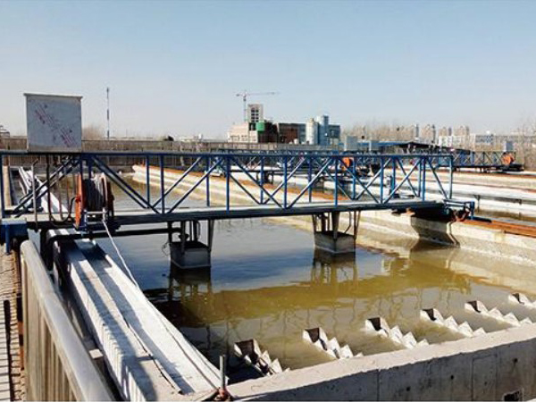 本設備由四點支撐行走大梁橫跨在平流式沉淀池上,雙邊驅動,池兩邊均鋪設鋼軌,從池的一端運行到池子的另一端,邊行走邊吸泥,到池端自動返回,回步同程吸泥,完成一個工作周期。懸浮液從長方形沉淀池的頭部進入,向池內擴散;比重大于水的小顆粒雜渣,向下沉于池底,被吸泥嘴吸入管內,用污水泵排放到污泥池