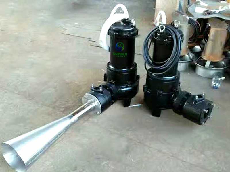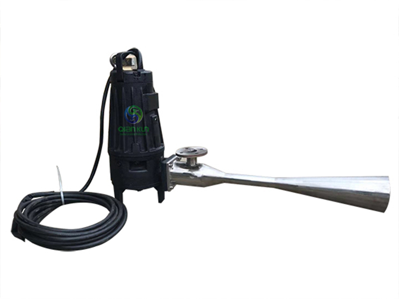 潛水泵工作后產生的水流經過噴嘴后形成高速水流,在混合室內由于噴嘴周圍形成負壓而吸入空氣,空氣經喉管與高速水流相遇,被撕碎成微氣泡與水形成氣水混合液,高速噴射而出,夾帶大量氣泡的水流在交大的范圍內產生強有力的單向液流,從而具曝氣、攪拌、推流一體,對推流生化反應池更為適用,同時在曝氣過程中,氣軸功率的隨潛沒深度的變化而變化,可以在水位變化較大的池中運用。