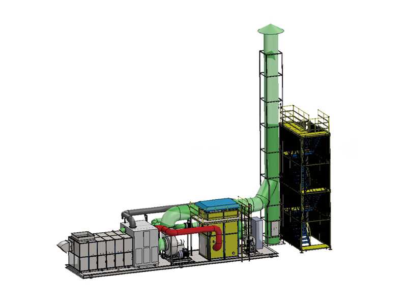 脫附產生的濃縮廢氣在進入催化床層之前,與高溫煙氣首先在換熱器單元進行換熱,預熱脫附廢氣并進入催化床。脫附氣體在催化床內升至300℃,進行催化氧化反應,有機成分被氧化成無毒無害的CO2和H2O,并放出熱量。形成的煙氣(<650℃)在排出時與進氣進行換熱后,達標排放。