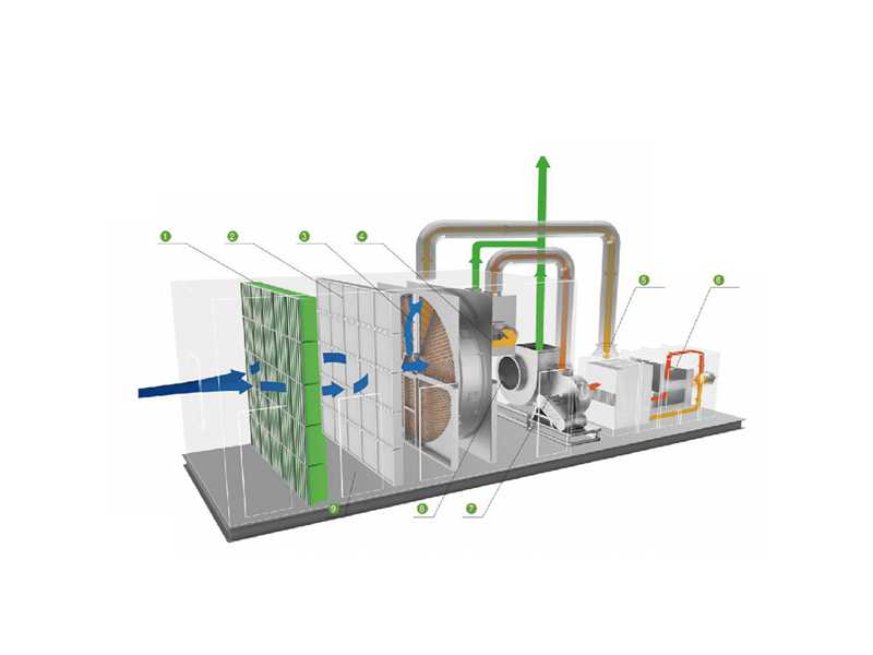 產品工藝經過預處理的廢氣進入沸石濃縮轉輪+催化燃燒系統,利用沸石分子篩的多孔吸附性將有機物吸附濃縮,濃縮后的有機物在300 400℃的溫度和催化劑的作用下將有機組分中的C、H化合物氧化分解成無害的CO2和H20等,達到凈化空氣的目的。技術原理經預處理(去除粉塵、顆粒物)后的有機廢氣流過濃縮轉輪時,其中的有機物在轉輪吸附區域會被吸附下來,經過吸附凈化后的廢氣(約占處理風量的85% 95%)排放到大氣中,一小部分廢氣(約占處理風量的5%~15%)對轉輪冷卻區降溫后經換熱器被加熱到180 220℃的脫附溫度后,流入脫附區,脫附區有機物從吸附劑一沸石上脫離到加熱的氣流中,轉輪得以再生,脫附后的高濃度VOCs被送入CO催化燃燒。脫附產生的濃縮廢氣在進入催化床層之前,與高溫煙氣首先在換熱器單元進行換熱,預熱脫附廢氣并進入催化床。脫附氣體在催化床內升至300℃,進行催化氧化反應,有機成分被氧化成無毒無害的CO2和H2O,并放出熱量。形成的煙氣(<650℃)在排出時與進氣進行換熱后,達標排放。
